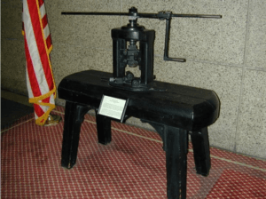 Below is a gallery with images illustrating the basics of 18th century coin production. The drawings are from An Essay on Coinage by Samuel Thompson. Although published in Ireland in 1783, the drawings show methods and machinery similar to those at the Mint. Screw presses fitted with a lower and upper die stamped the coin designs. They were operated by one to three men, depending on the size of the press. Smaller screw presses operated by one man were also used as cutting presses.